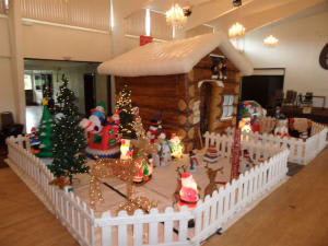 comes with the inflatable grotto, white picket fencing and theming to the front and sides and a good quality Santa and Elf suit. The theming will come with an assortment of 15 to 20 different Christmas decorations to brighten up and attract children to the area. The decorations will vary but there will be Christmas trees, Christmas decorations that play festive music, snowmen, presents, Santa's Throne and much more. Depending on the event times, if you are hiring the grotto for an evening event we can include lights and light up decorations to make the area bright and colourful.