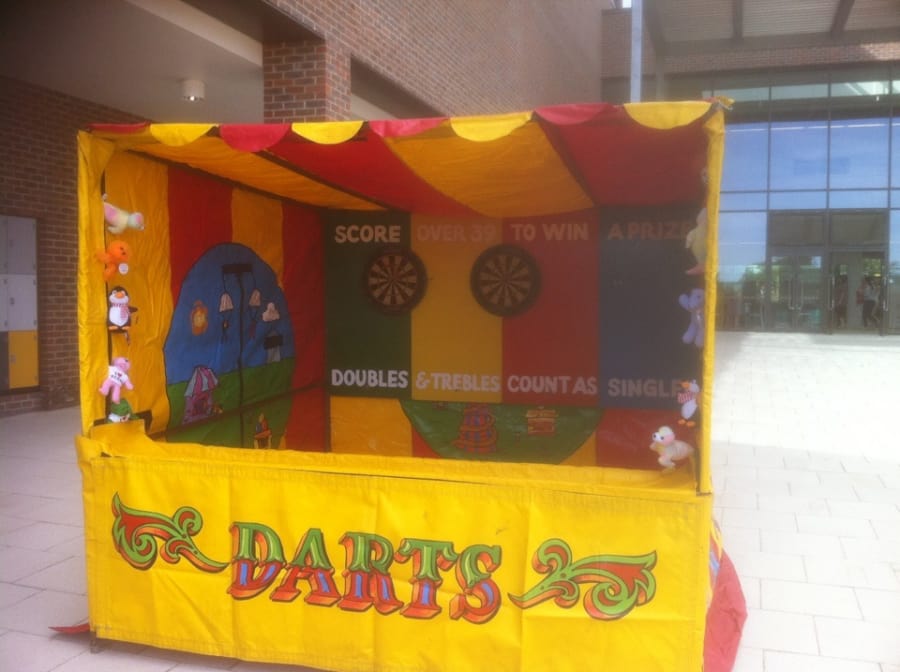 You can add a member of staff to supervise the equipment and prizes at an extra cost. You can be sure of scoring a bulls-eye with our amazing darts stall hire. Darts is much more than a hugely popular TV competition. It's been a great fairground attraction since mediaeval days and of course a regular feature in pubs and clubs for centuries. That's why your guests will love to try their hand at this age-old skill and maybe win a prize too. Decked out in bright, contrasting colours and fairground-style lettering, our darts stall is sure to catch your guests' attention. With three darts boards, it's large enough to cater for small groups of players to compete against each other at the same time too. The magic winning number can be lowered a shade if necessary so that less experienced competitors and younger guests can still win a soft toy prize. So step up to the oche and see if you can score three in a bed! We deliver our darts stall to London (especially North London, East London and North-East London), Essex, Kent, Surrey, Sussex and Hertfordshire.