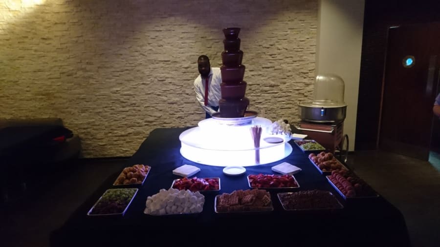 6 Tier Chocolate Fountain hire Everyone loves a chocolate fountain cascading down 6 tiers, glistening in the light, begging to be dipped! Once you take a succulent strawberry and smother it with warm Belgium chocolate, you just won’t be able to stop yourself !! . Choose from the following 2 options: DIY Service (100 servings) - £375 • 6 Tier Chocolate Fountain • Illuminated Base • 10kg of Belgium Chocolate • No Dips • No staff • up to 8 hour hire